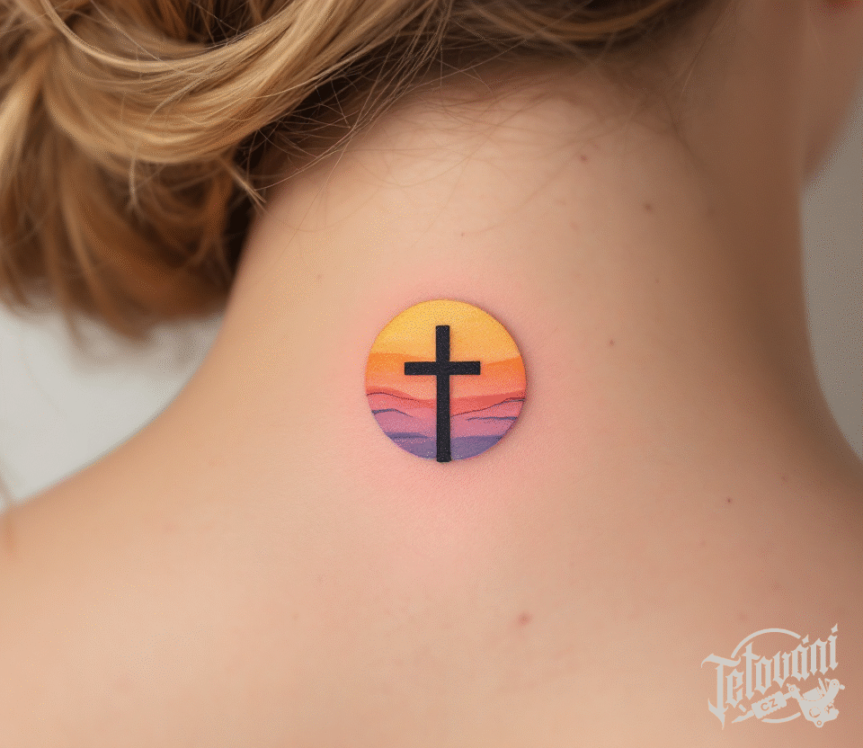 Tetování kříž a slunce na krku