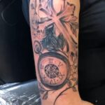 Tetování kříž, kapesní hodiny, rlže na paži
