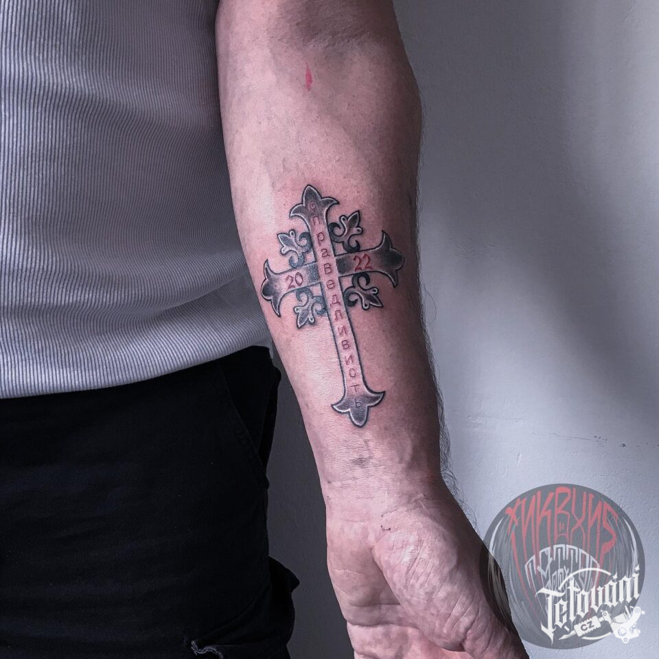 Tetování kříž, nápis, čísla a ornamenty na předloktí