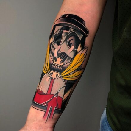 Tetování kříž, oko, anděl, přesýpací hodiny na rukávu