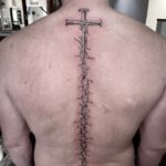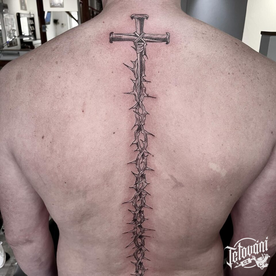 Tetování kříž, ostnatý drát na páteři