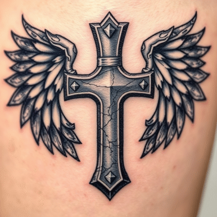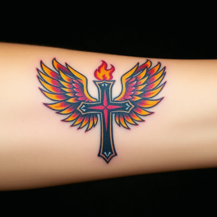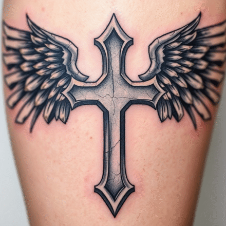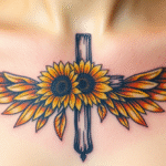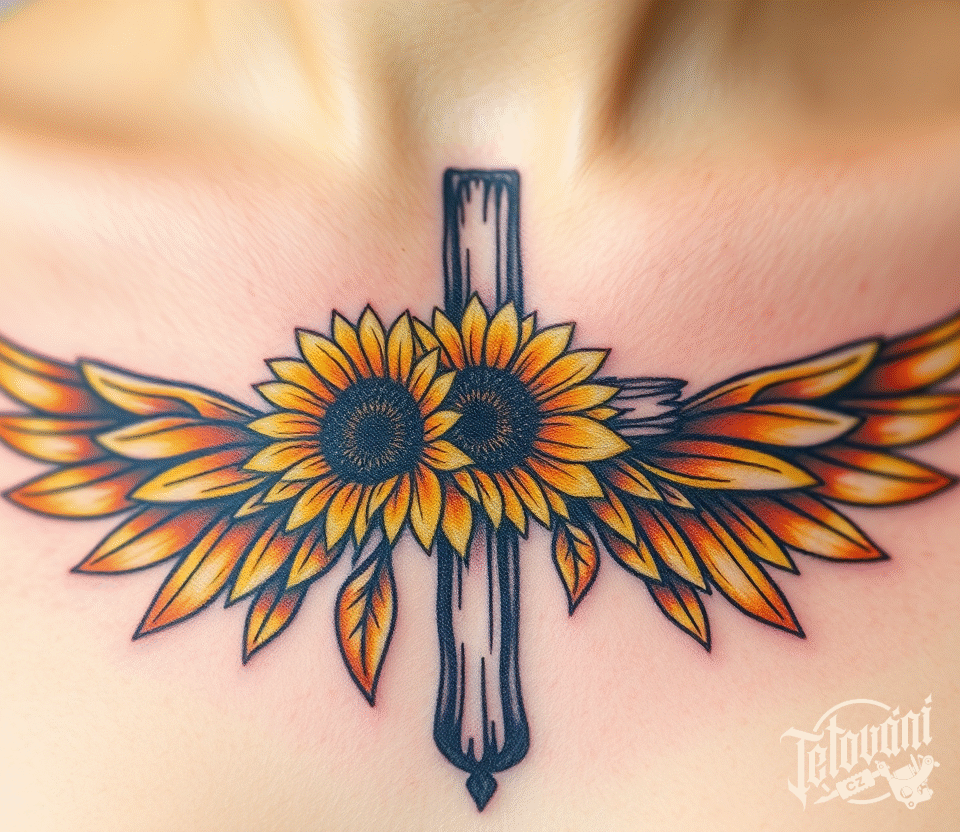 Tetování kříž s křídly a květy slunečnic na hrudník