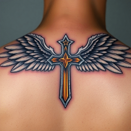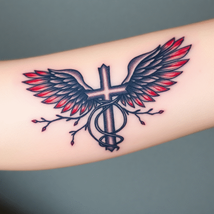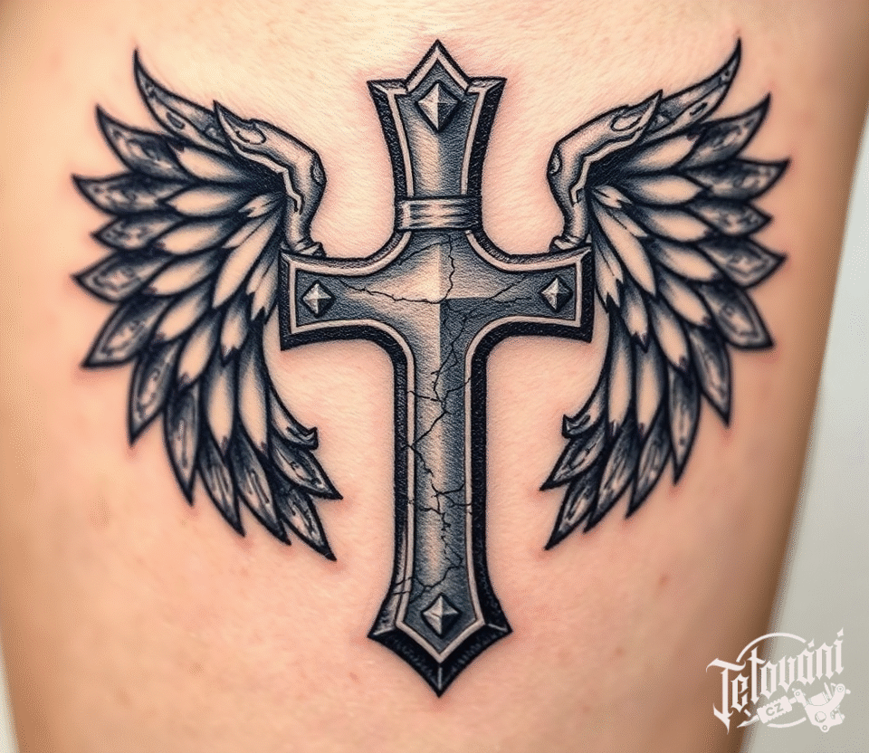 Tetování kříž s křídly na bok stehna