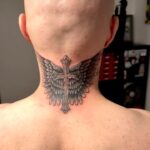Tetování kříž s křídly na krku