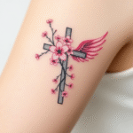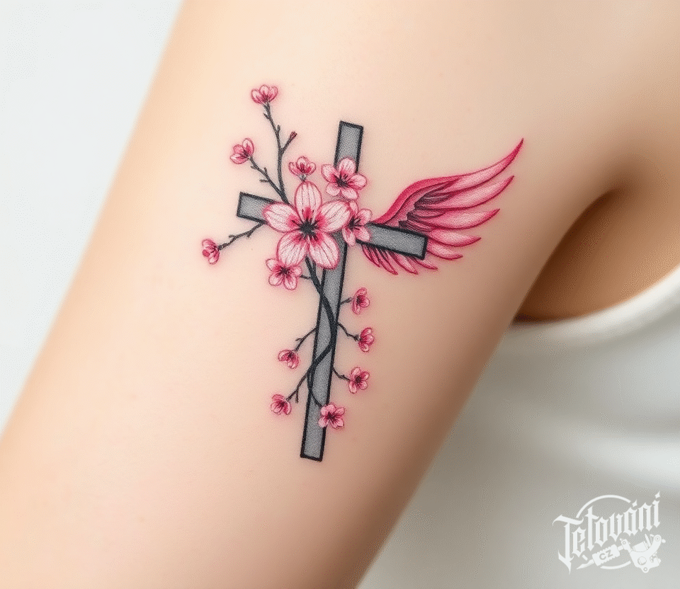Tetování kříž s květy a křídlem na rameno