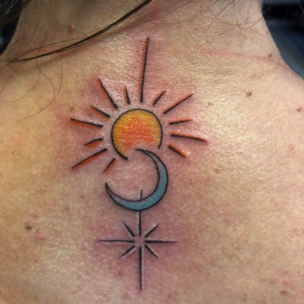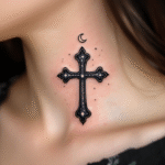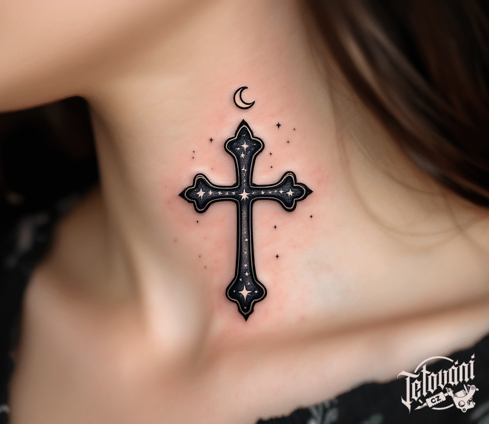 Tetování kříž s měsícem a hvězdami na krku