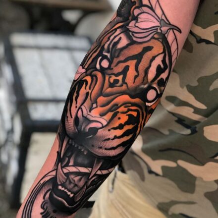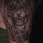 Tetování kříž s nápisy, zvíře tygr na rameno