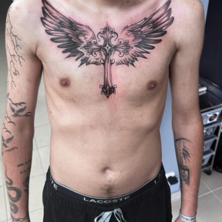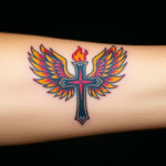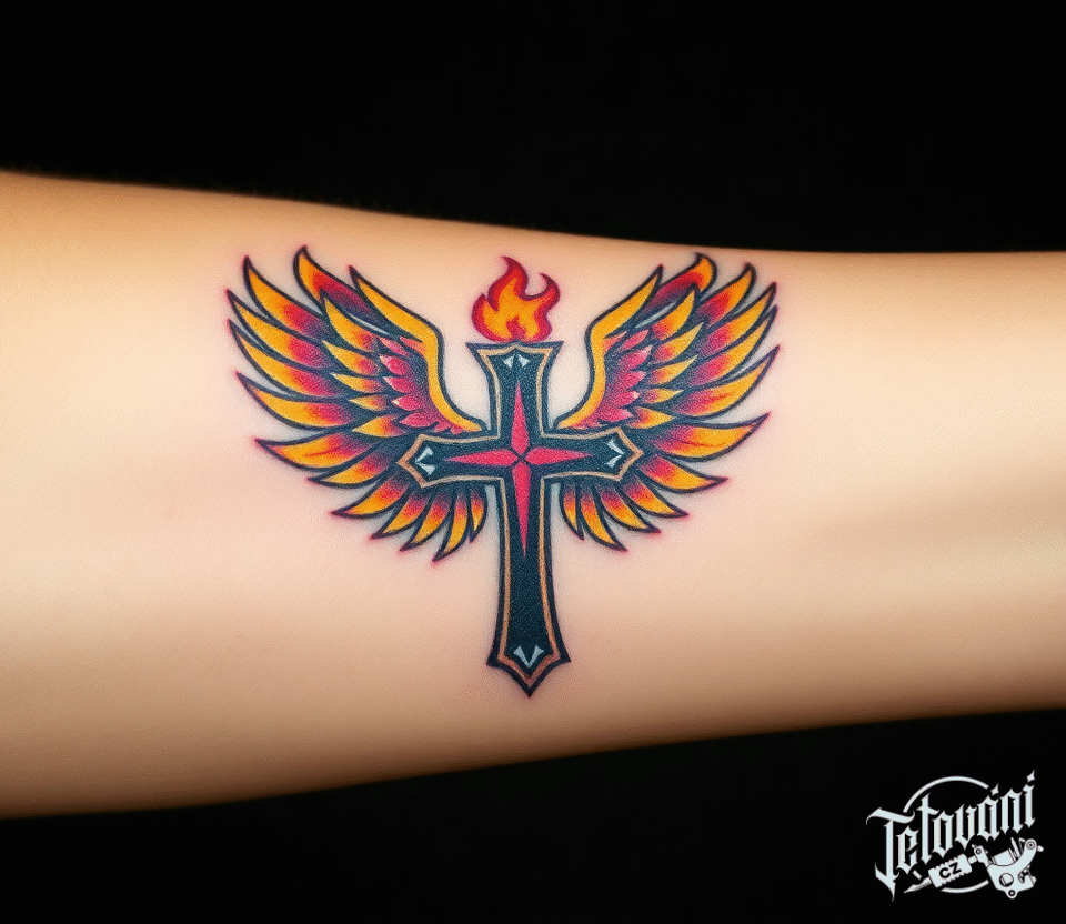 Tetování kříž s ohněm, živel a křídly na předloktí