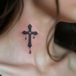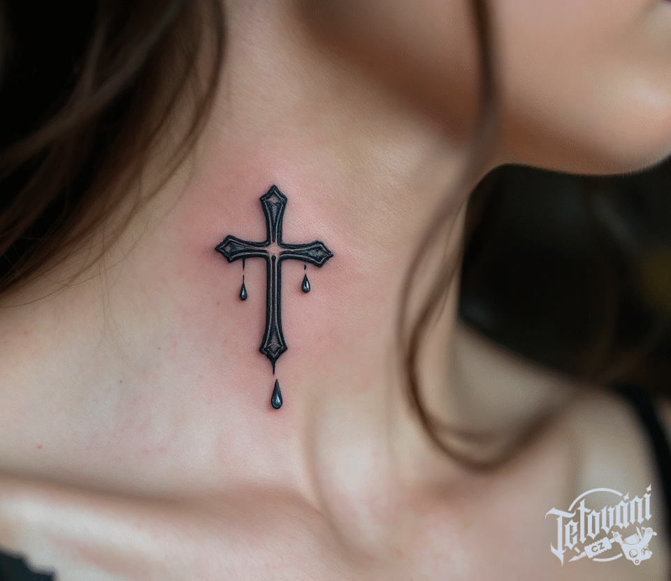 Tetování křížek s kapkami na krku