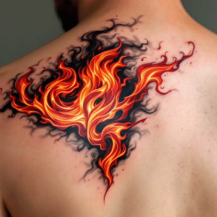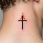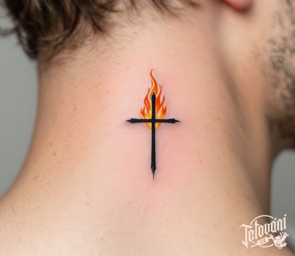 Tetování křížek s ohněm na krku