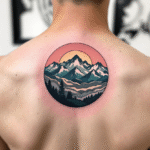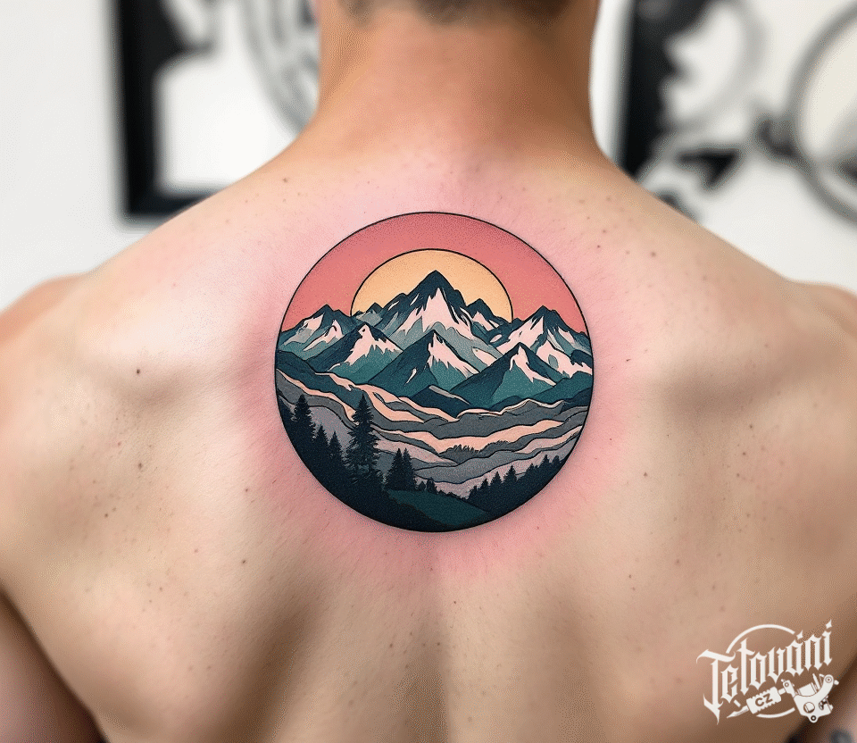 Tetování kruh, tvar, hory, příroda mezi lopatky