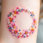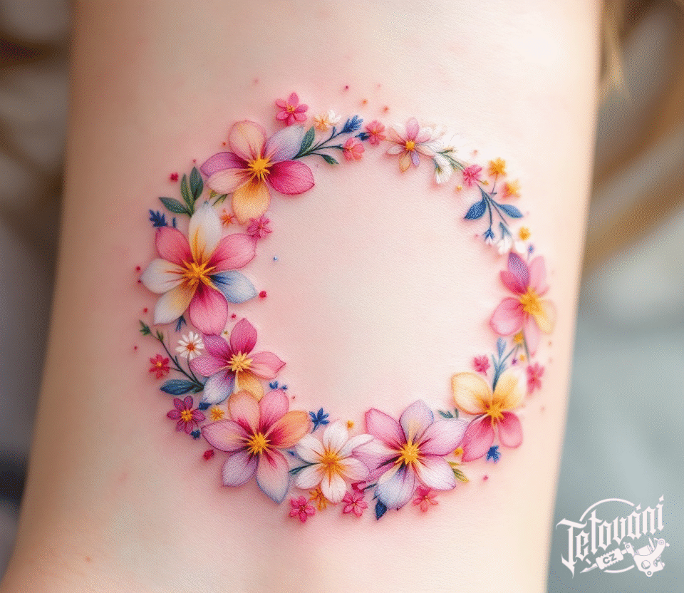 Tetování kruh z květin na rameno