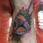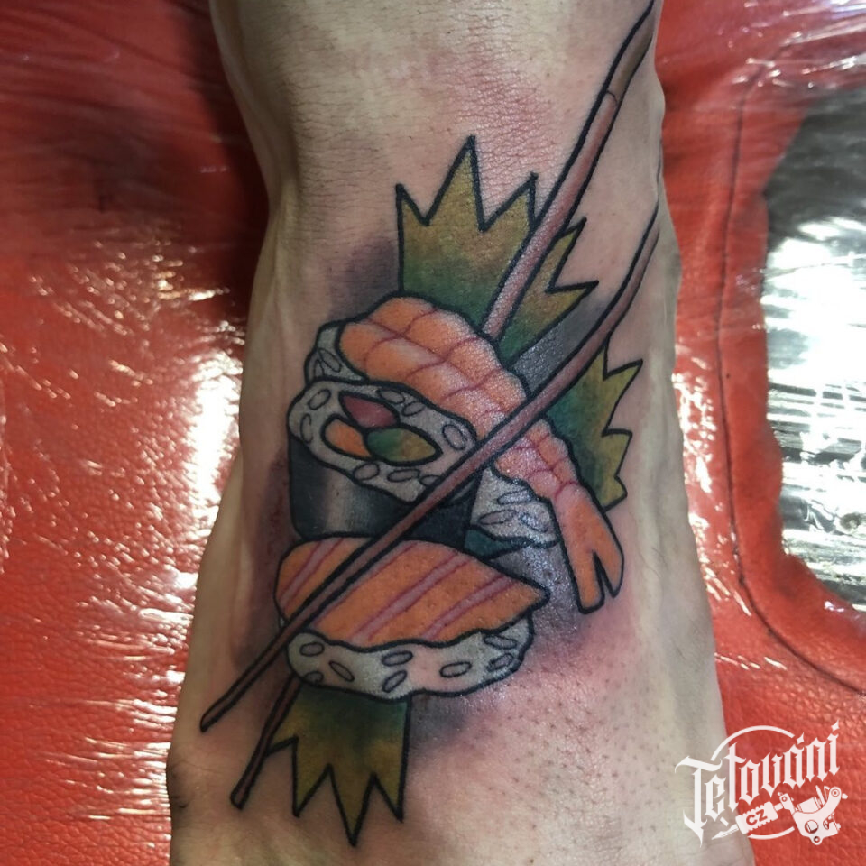 Tetování kuchaři, jídlo sushi na nárt