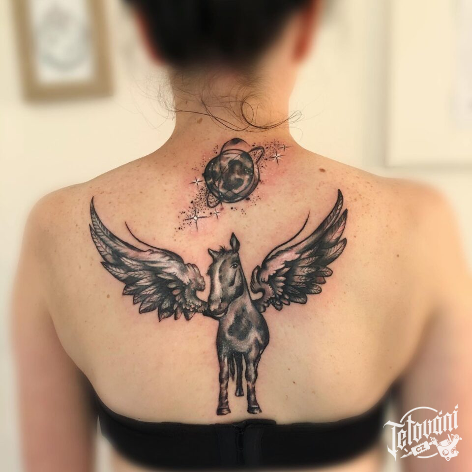 Tetování kůň s křídly, planeta na záda