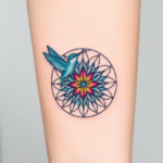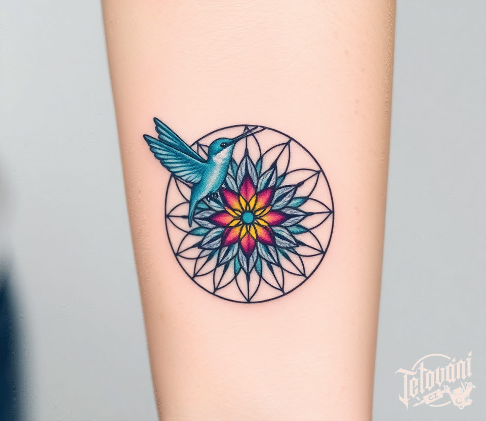 Tetování květ života jako symbol energie a rovnováhy s kolibříkem na předloktí