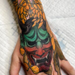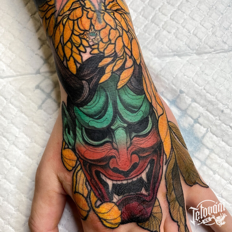 Tetování květina a ďábelská maska hannya na hřbetu ruky