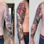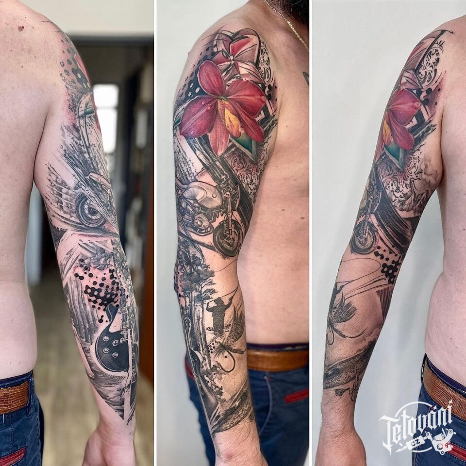Tetování květina a dopravní prostředek, orchidej a motorka, rukáv