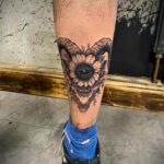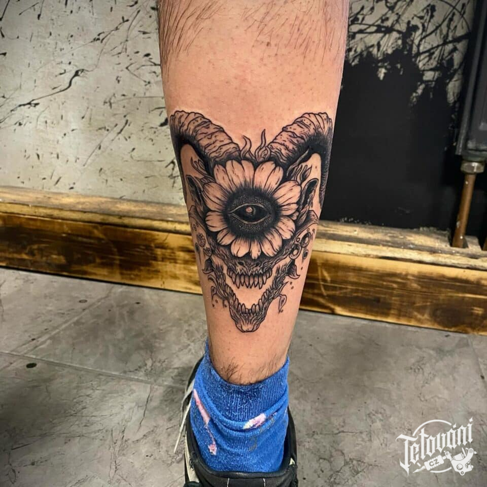 Tetování květina a lebka berana na lýtko