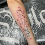 Tetování květina a nápis se jménem na předloktí