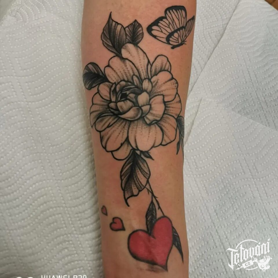 Tetování květina a srdce na předloktí