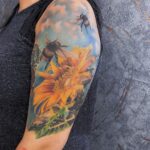 Tetování květina a zvířata, slunečnice a včely na rameni