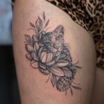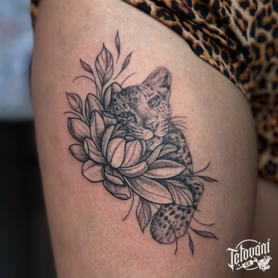 Tetování květina a zvíře, divoká kočka a lotos na stehně