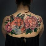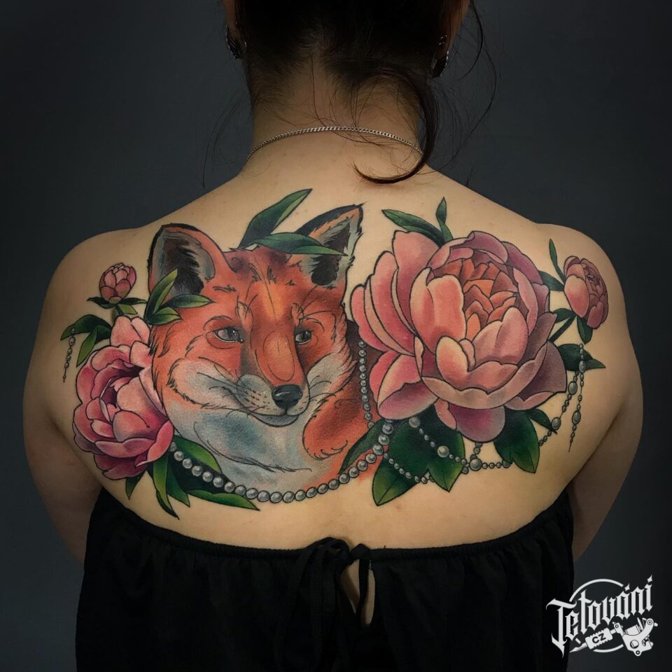 Tetování květina a zvíře, liška na zádech