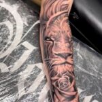 Tetování květina a zvíře, růže a lev na předloktí