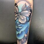 Tetování květina a zvíře, růže a motýl na předloktí