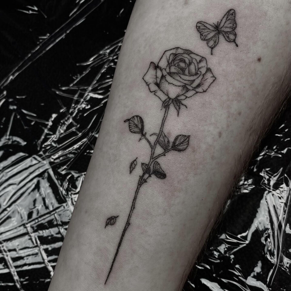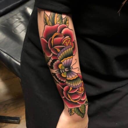 Tetování květina a zvíře, růže a motýlek na předloktí