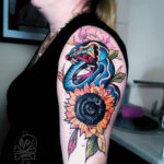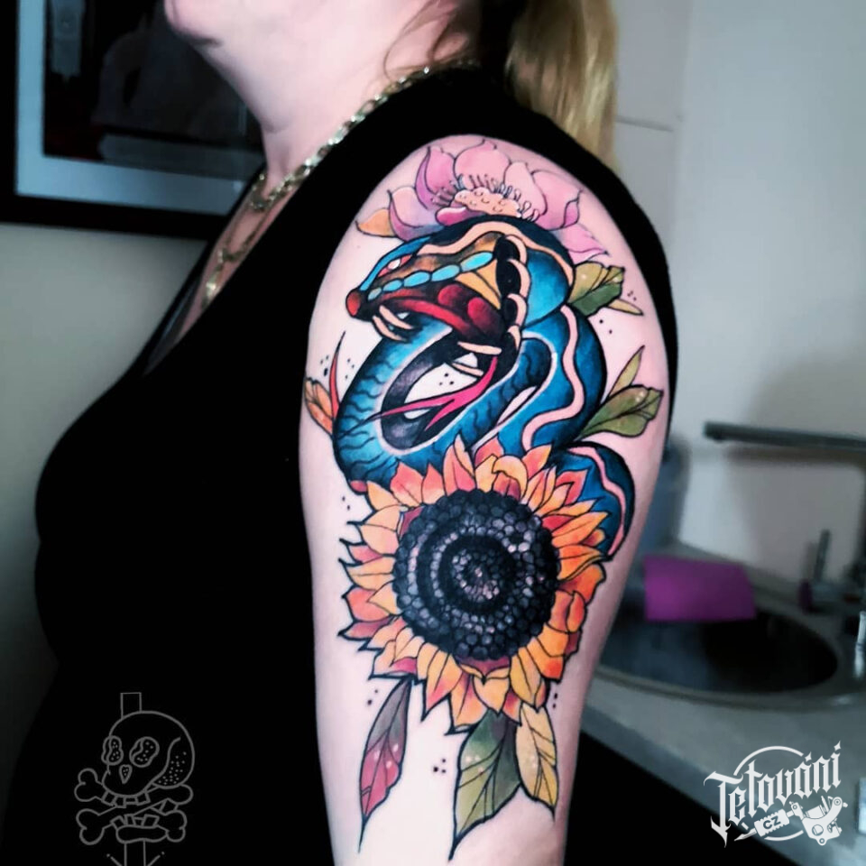 Tetování květina a zvíře, slunečnice a had na rameni
