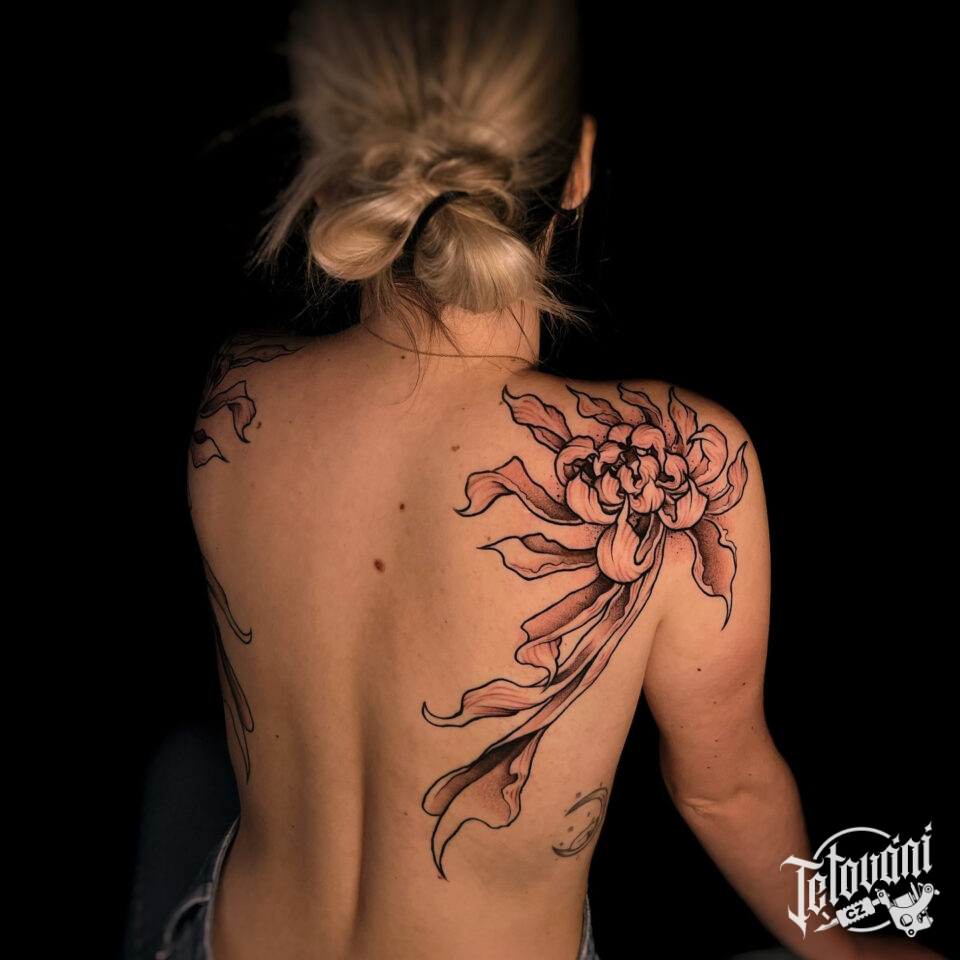 Tetování květina, chrizamtéma na lopatce