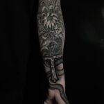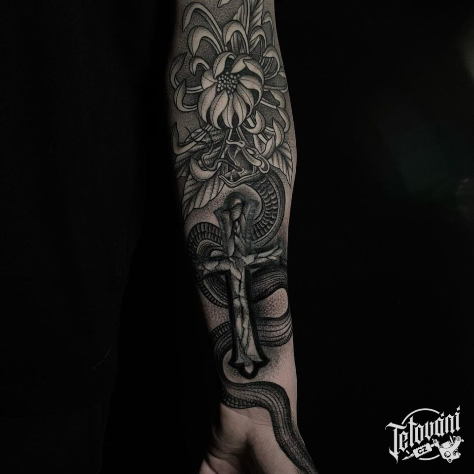 Tetování květina, kříž a zvíře had na předloktí