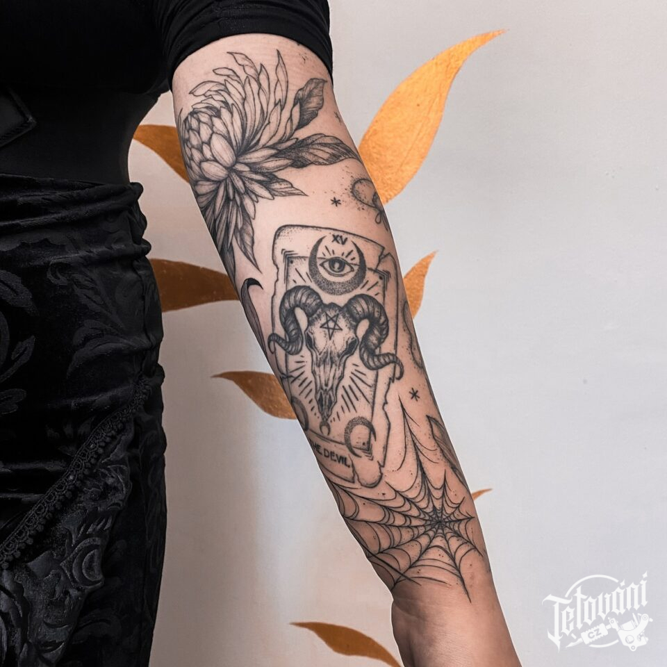 Tetování květina, lebka zvířete, pavučina na ruce