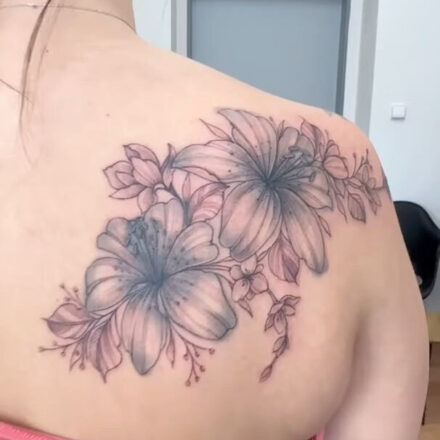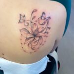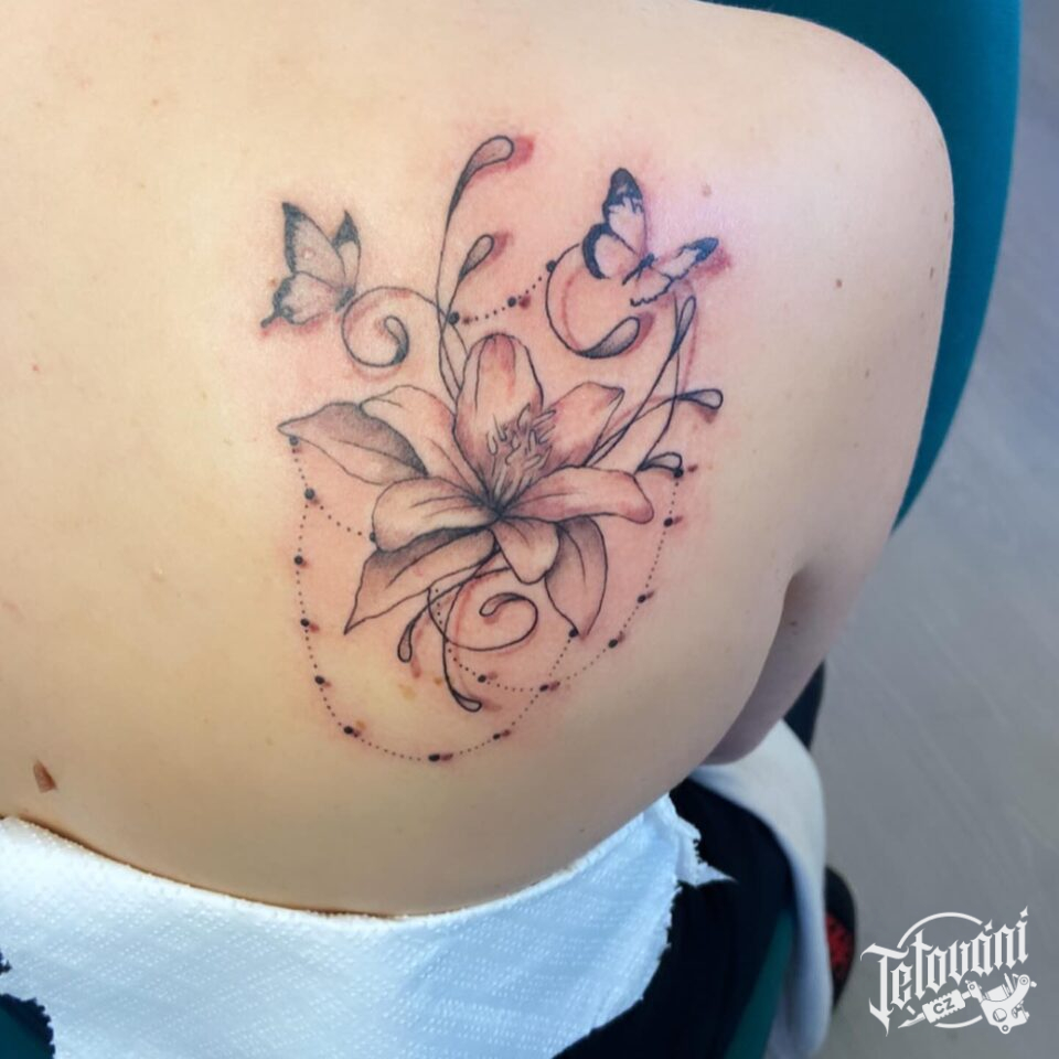 Tetování květina, lilie a motýlci na lopatce
