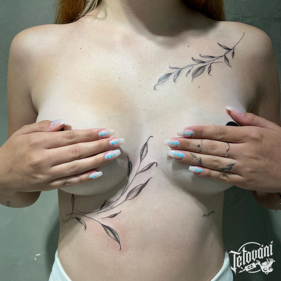Tetování květina, listy pod klíční kosti