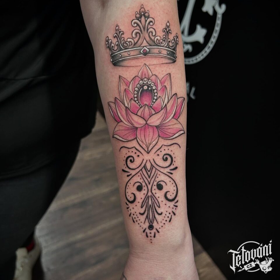 Tetování květina, lotos, ornament, diamant s korunou na předloktí
