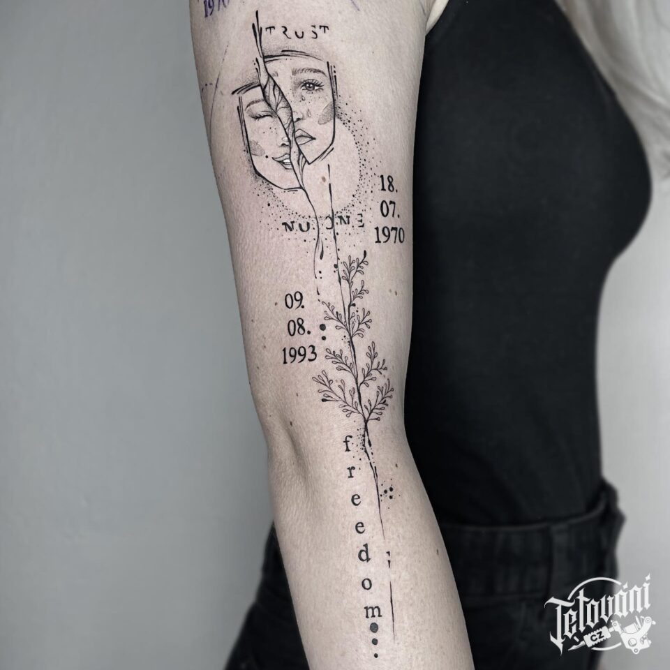 Tetování květina, luční kvítí, portrét, datumy, nápisy na ruku