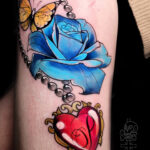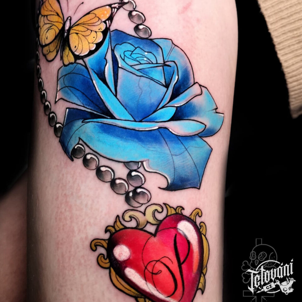 Tetování květina, modrá růže, zvíře, motýl, řetízek srdce s písmenem na stehně