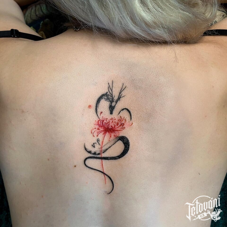 Tetování květina, mýtická bytost drak na páteř