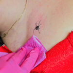 Tetování květina za uchem a zvíře, pavouk pod klíční kostí