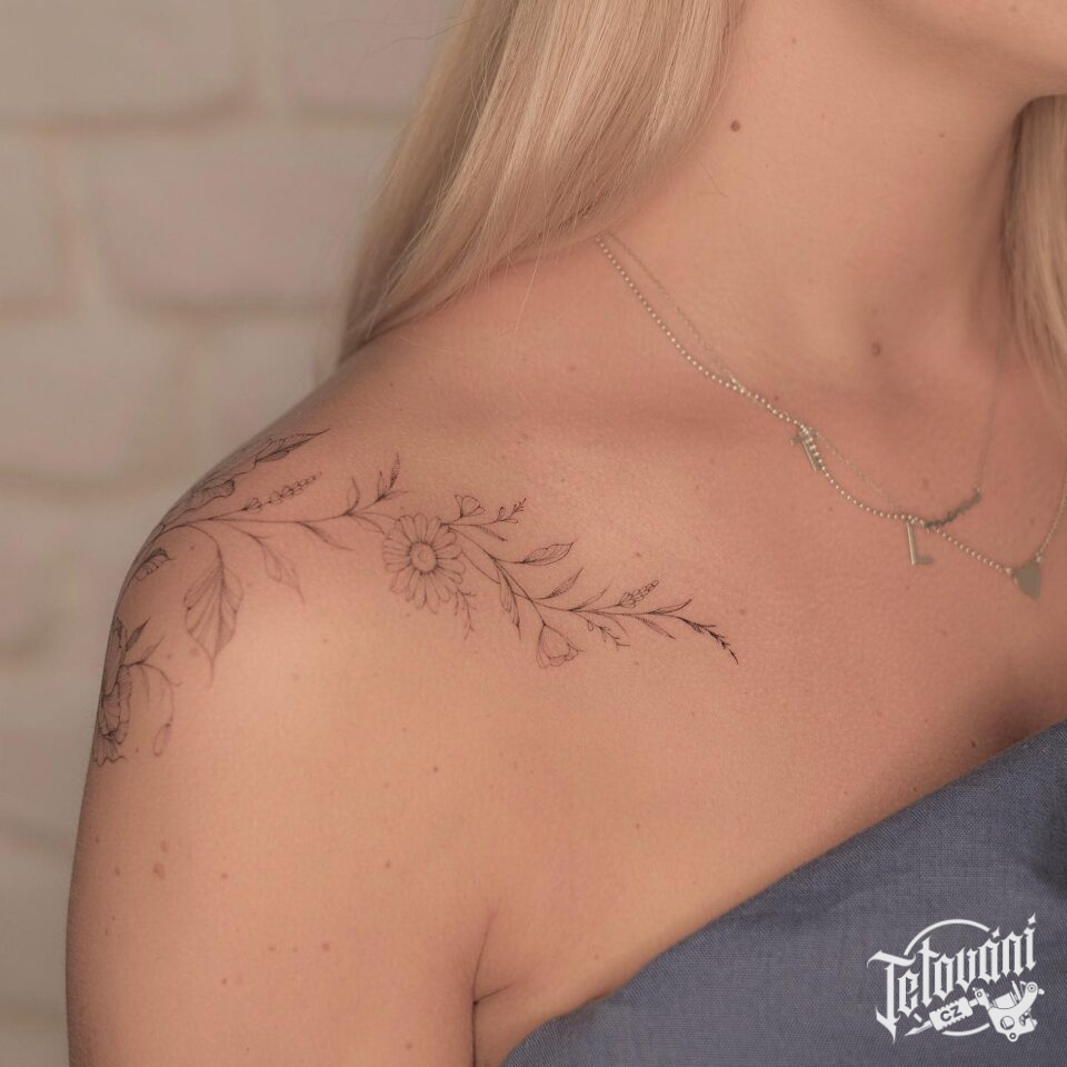 Tetování květina na rameno, pod klíční kost