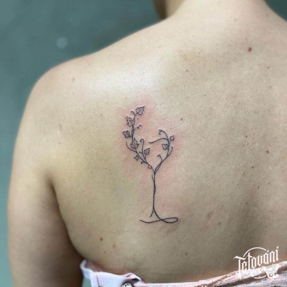 Tetování sklenička vína s květinami na lopatce