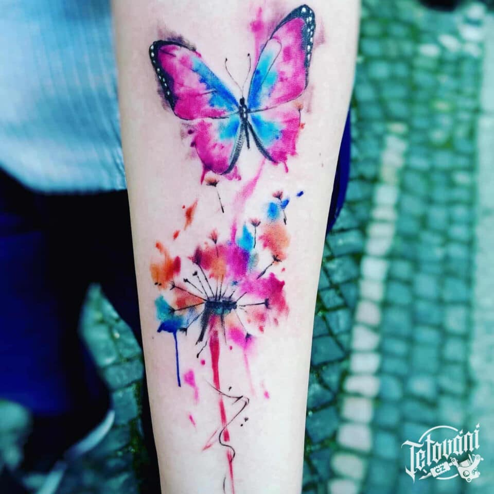 Tetování květina pampeliška, zvíře motýl na předloktí