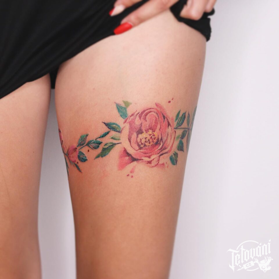 Tetování květina pivoňka na stehno
