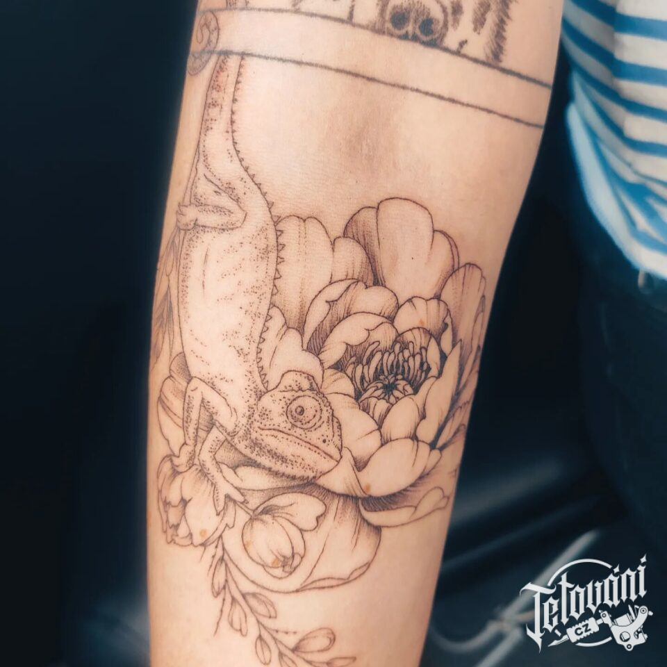 Tetování květina pivoňka, zvíře ještěrka na předloktí