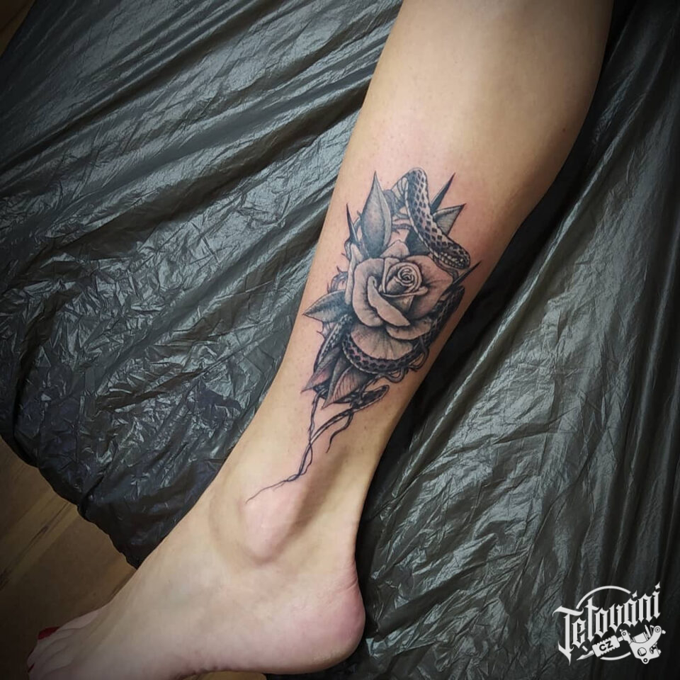 Tetování květina růže a had na nohu