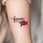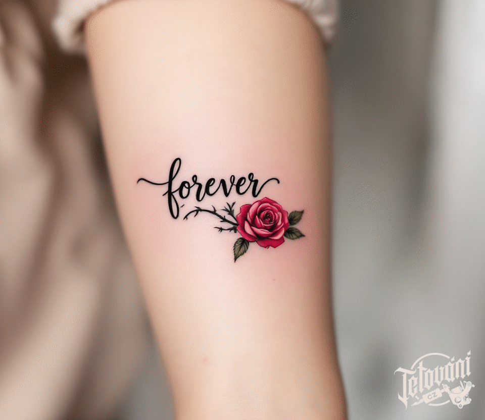 Tetování květina růže a nápis forever na předloktí