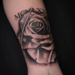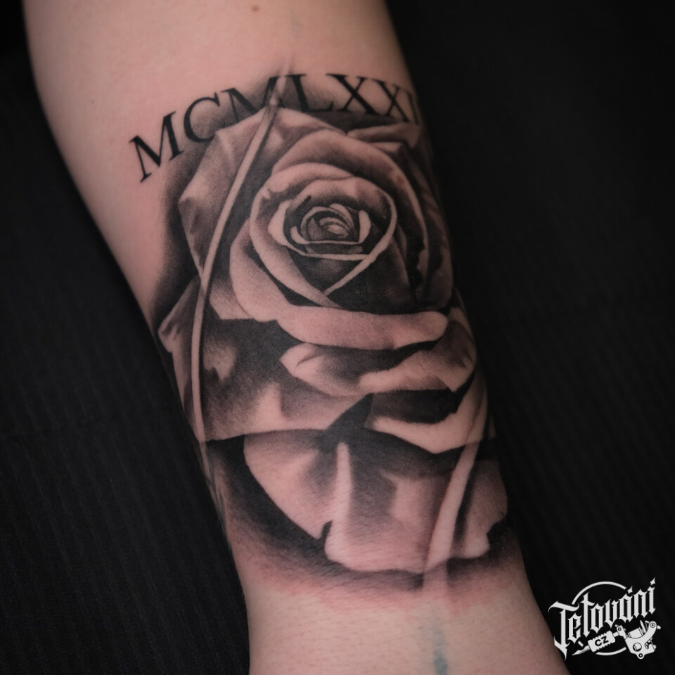 Tetování květina, růže a římská čísla a předloktí