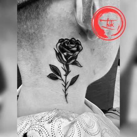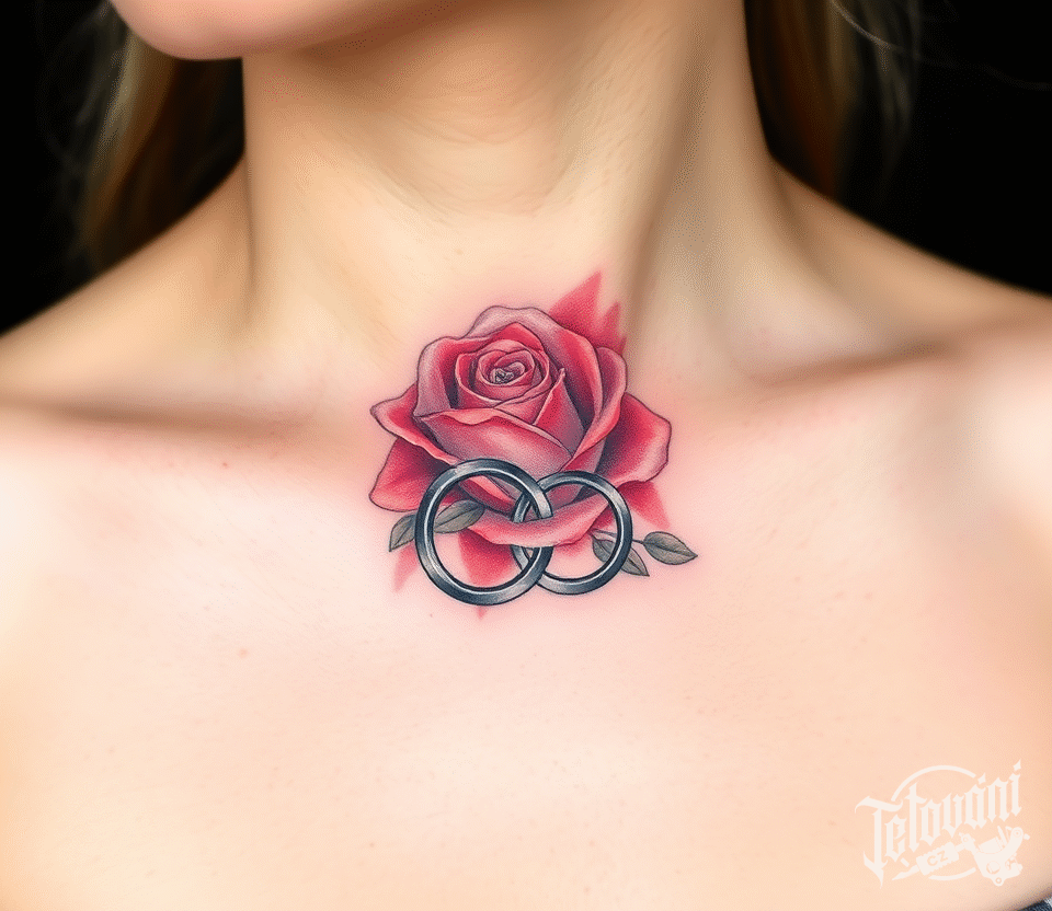 Tetování květina, růže a svatební tetování, svatba, snubní prsteny na krk